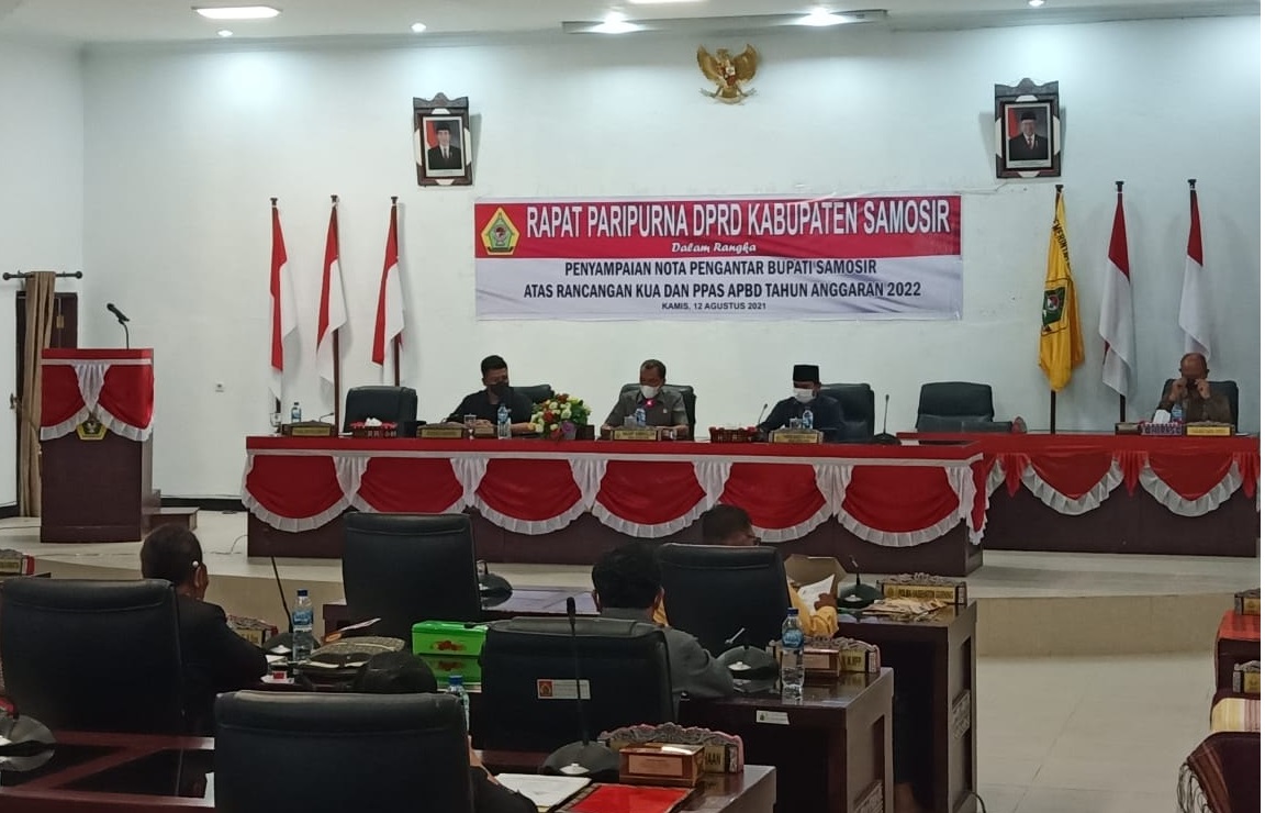 Bupati Samosir menyampaikan Rancangan Kebijakan Umum Anggaran dan Prioritas Plafon Anggaran Sementara APBD Tahun Anggaran 2022 yang diawali mengajak mendoakan agar wabah Covid-19 segera teratasi dan menyampaikan apresiasi dan terimakasih kepada seluruh tenaga kesehatan, TNI, Polri dan relawan yang telah bekerja keras dalam penanganan covid-19 di Kabupaten Samosir.